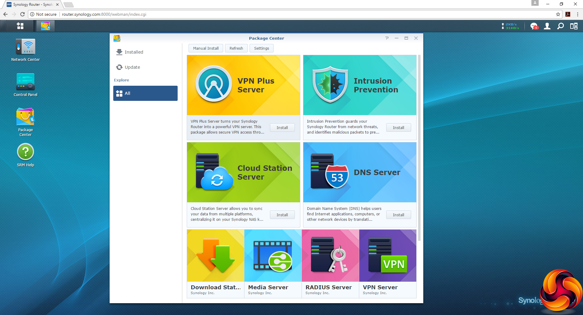 Although the RT1900ac has less powerful hardware than the RT2600ac, the same rich selection of downloadable apps are available in the Package Center. This is one of the big strengths of Synology products. The optional software available is immense, and very easily installed, so you can turn your router (or NAS) into something that suits your needs very well.