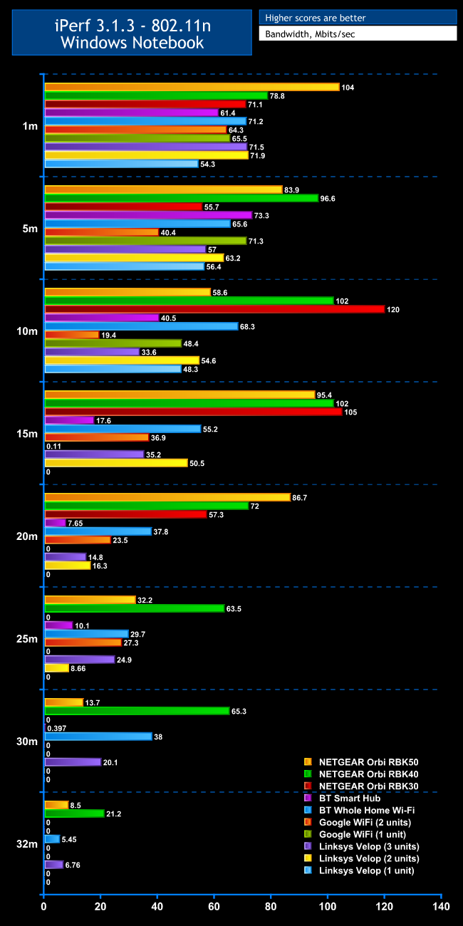 The four units that were still in contention at 30m remain at 32m, although the Orbi RBK50 regains its second place, with the RBK40 first. Unlike with 802.11ac, the Linksys Velop three-unit configuration managed to penetrate the shed in 802.11n mode, and achieved third place, but the BT Whole Home Wi-Fi wasn't that far behind, although both performance levels would only be enough for Web browsing and email, probably not watching video smoothly.