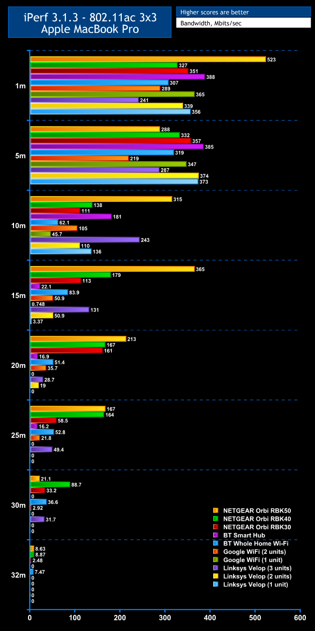There's a clear winner at 1m – the original Orbi RBK50. But a surprising second is the BT Smart Hub, although it's quite a bit behind. The other Orbis do quite well, as does the single Google WiFi unit, and the single Linksys Velop. The three-unit Velop fares worst. But in reality all these results are quick enough for multiple users in close proximity.