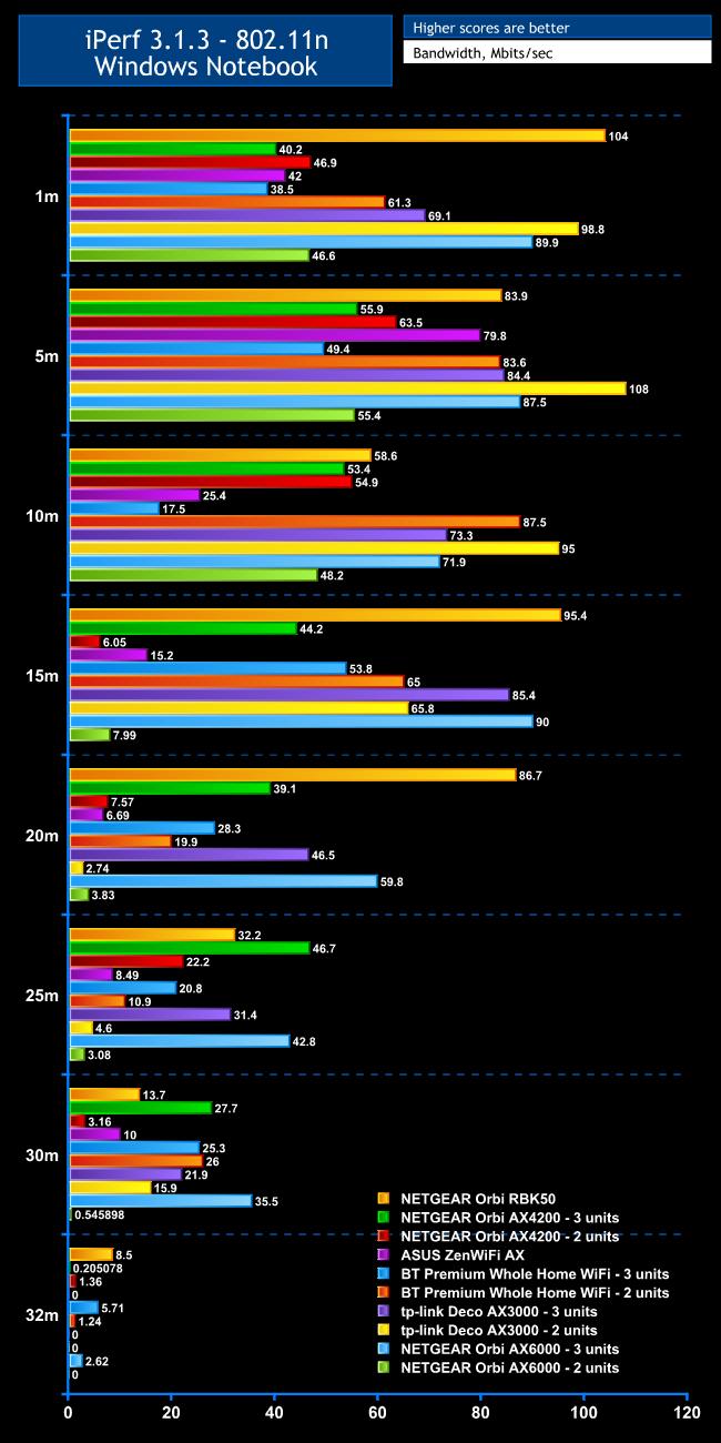 Overall, the original NETGEAR Orbi RBK50 shows it's still great for 802.11n connectivity, and the Orbi AX6000 again underlines how it is worth the extra money if you want range. The revelation here is the three-unit BT Premium Whole Home Wi-Fi, which was still going strong at 32m. The three-unit NETGEAR Orbi AX4200 does very well out to 30m, and tp-link is more than acceptable, particularly with three units.