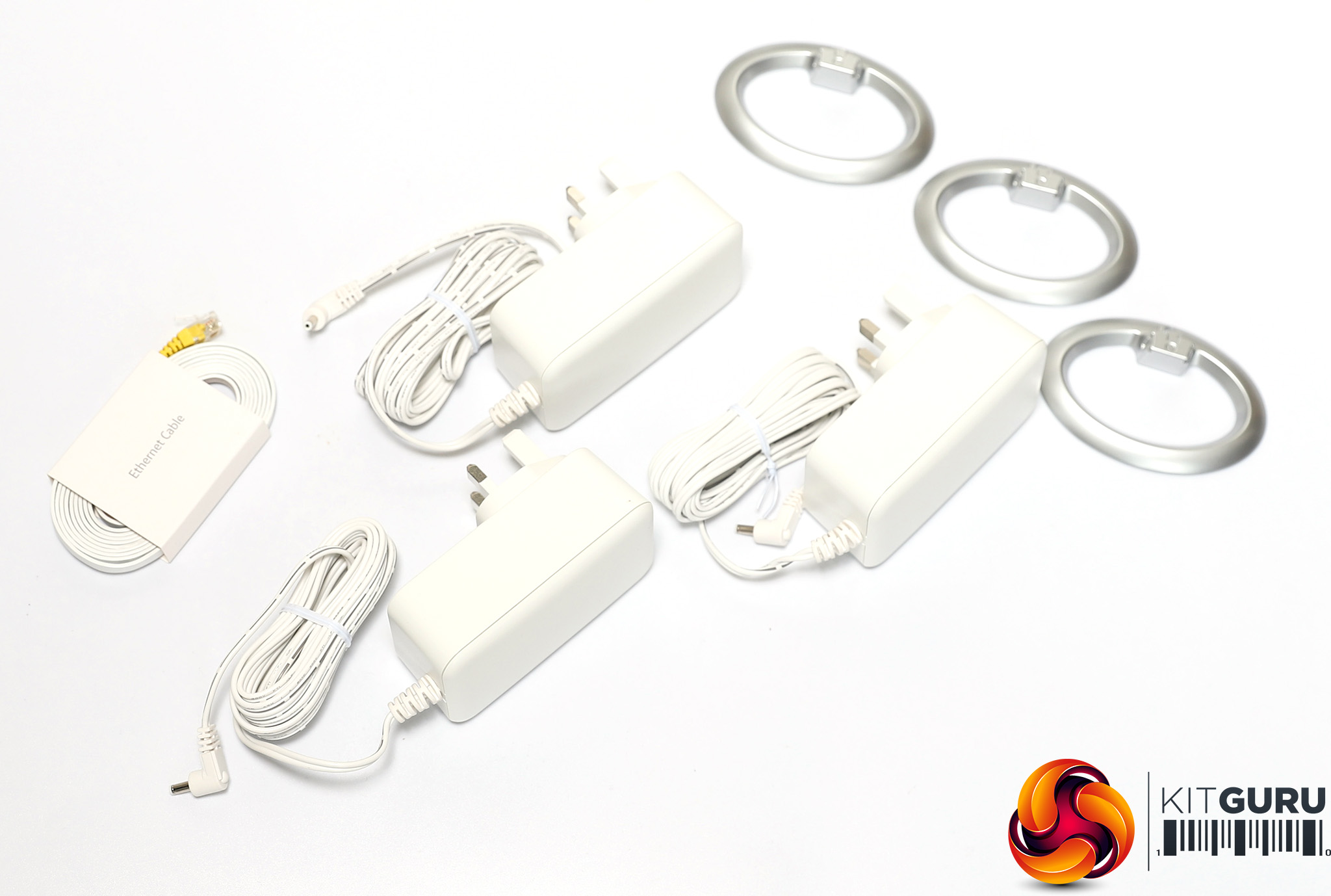 Inside the box you get the usual set of external power adapters – UK plug only – and a ribbon Ethernet cable for your broadband modem, plus the silver rings for vertical mounting.