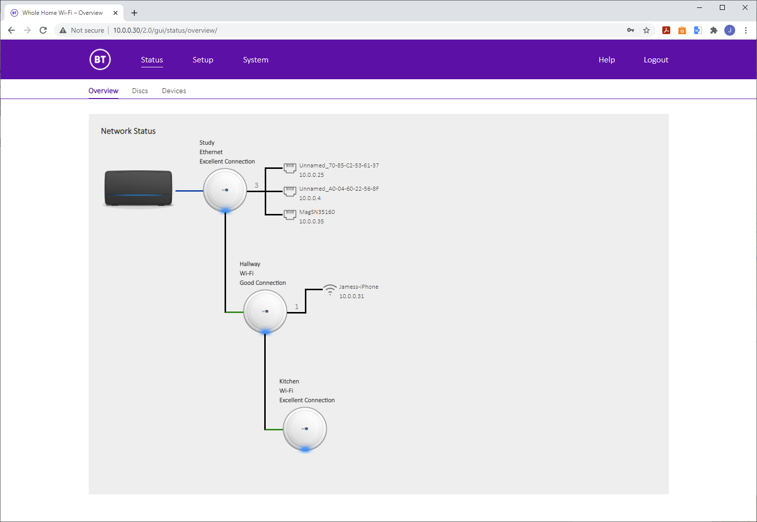 BT's wizard process is the most easy to follow of all. Not only does it guide you step-by-step through adding each device to the mesh, it even includes a section where it will measure how good the signal strength is before you set things up, and warn you if it's weak.