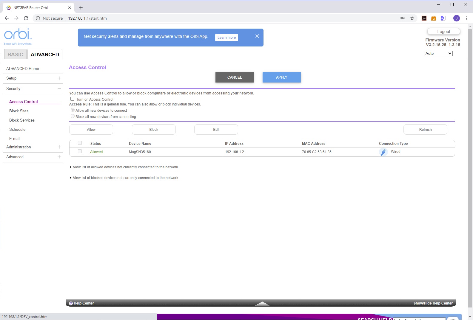 However, the Web interface is much more fully featured. This is divided into Basic and advanced, which overlap but Advanced adds more granular configuration. In particular, you get access control abilities, including the facility to block or permit devices, sites and services, and add a schedule to the latter two. You can switch between router and access point modes, configure port forwarding and triggering to make devices inside the internal network accessible via the Internet, and set up Dynamic DNS with either NETGEAR's service or No-IP. The router can act as an OpenVPN server, and you can set up VLANs. The options aren't as extensive as standalone NETGEAR routers, but there's more than enough here to use the Orbi as your main router and not miss that standalone one.
