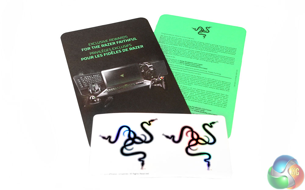 Along with the mouse itself, the only accessories are a small sticker sheet of the Razer logo with various coloured outlines, and a pair of mufti-lingual sheets welcoming the buyer to the Razer club. It also provides details on signing up for exclusive giveaways and encourages users to post a review of the mouse.