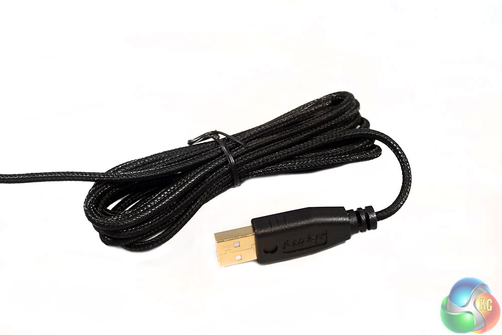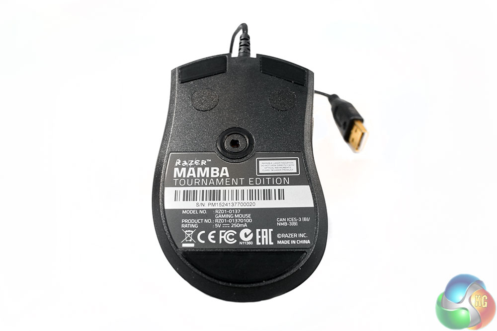 The underside of the mouse (besides being something you should not look at when it is plugged in: laser!) has a centrally located sensor, and three polytetrafluoroethylene (unbranded Teflon) pads. The cable is braided, with a gold leaf header.