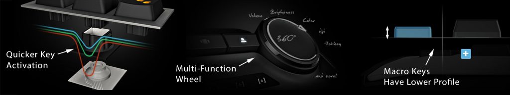Other gamer-oriented features include programmable macro keys that are half-height (so they activate quicker), and a multi-function wheel to help you access/control all the new functionality quicker. Click on the following image to get more detail.