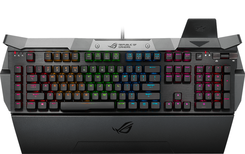 The ROG Horus GK2000 RGB follows on from the previous GK2000 with static red lighting, adding a few new features to boot. Alongside the added RGB lighting and switches, the Horus RGB is able to be synced with ASUS Aura. Its new 32-bit MCU controls lighting effects, profile settings and macro creation, stored in the now-doubled 8MB memory.