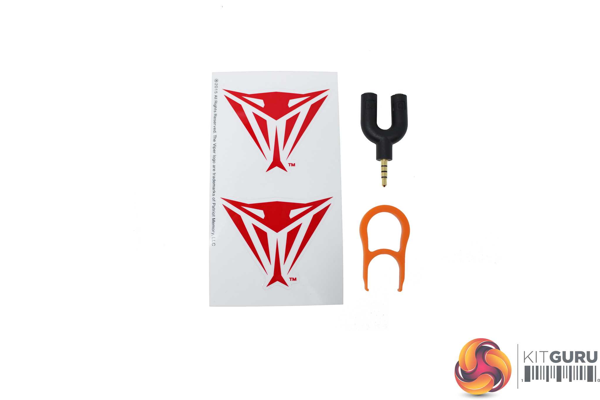 Alongside the keyboard, the box contains two stickers with Patriots Viper head logo, a tool to easily remove key caps for cleaning and replacement, and the surprising addition of a headphone splitter that can be used with the keyboard's audio pass-through, although more on that later.