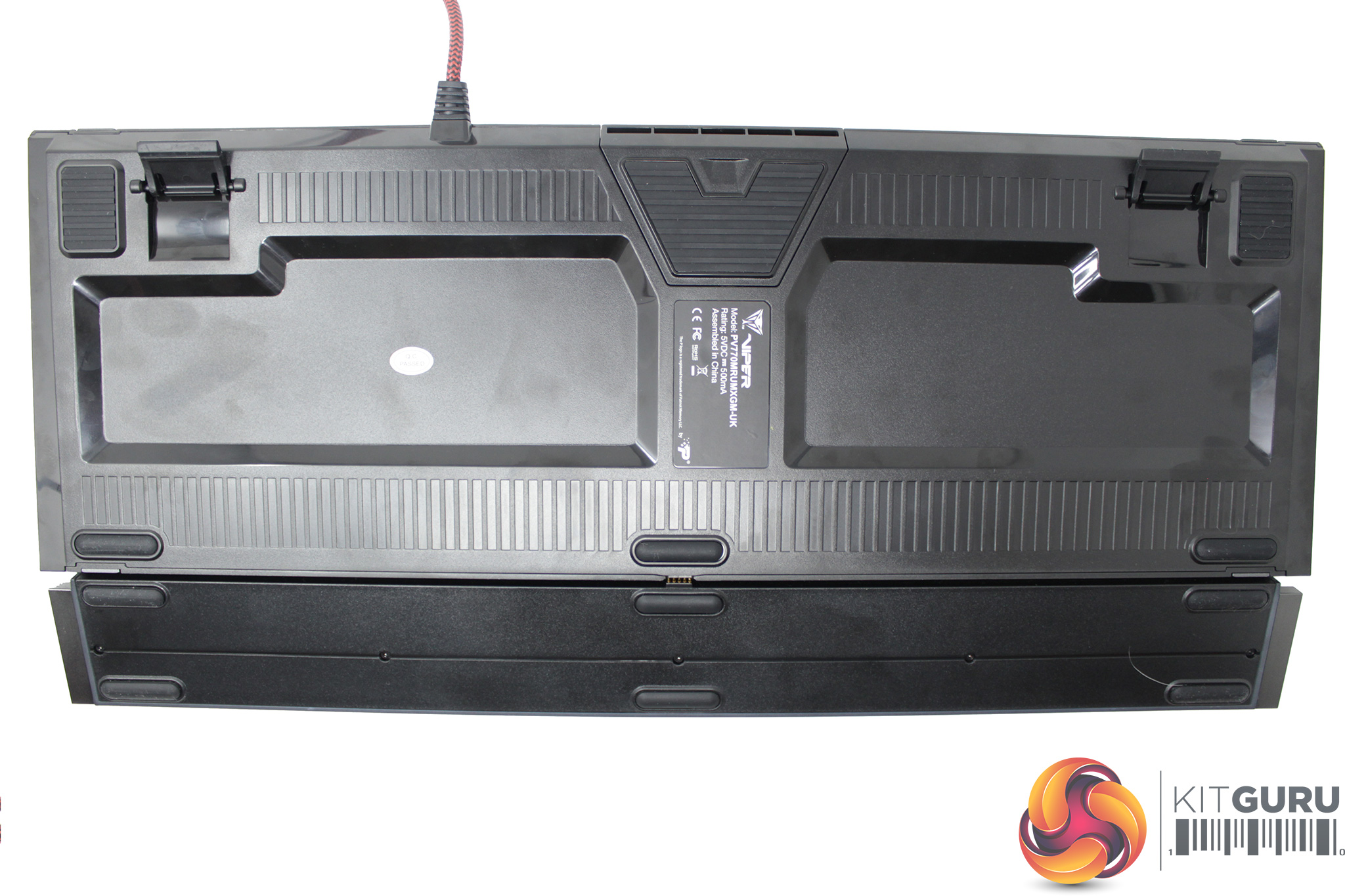 The underside of the keyboard isn't particularly special, with core information about the product prominently displayed on a sticker in the centre, two hinged stands located at the rear and two rubber non-slip pads to firmly hold it secure when it isn't propped up. Due to the pass-throughs, the Viper V770 includes a lot of input options.