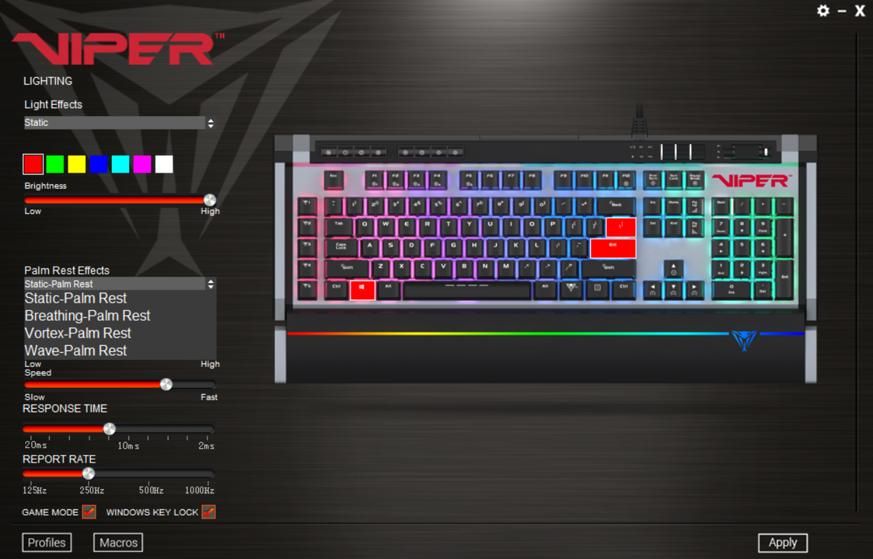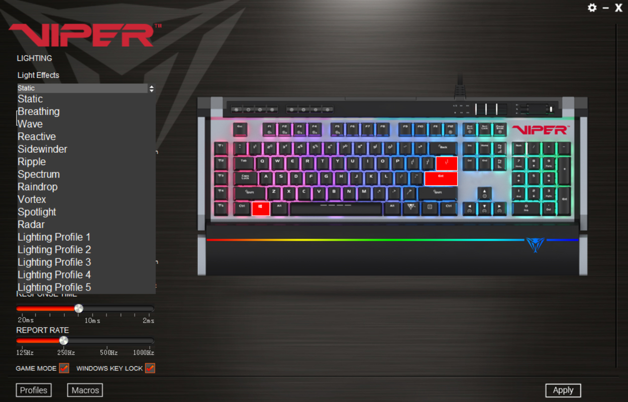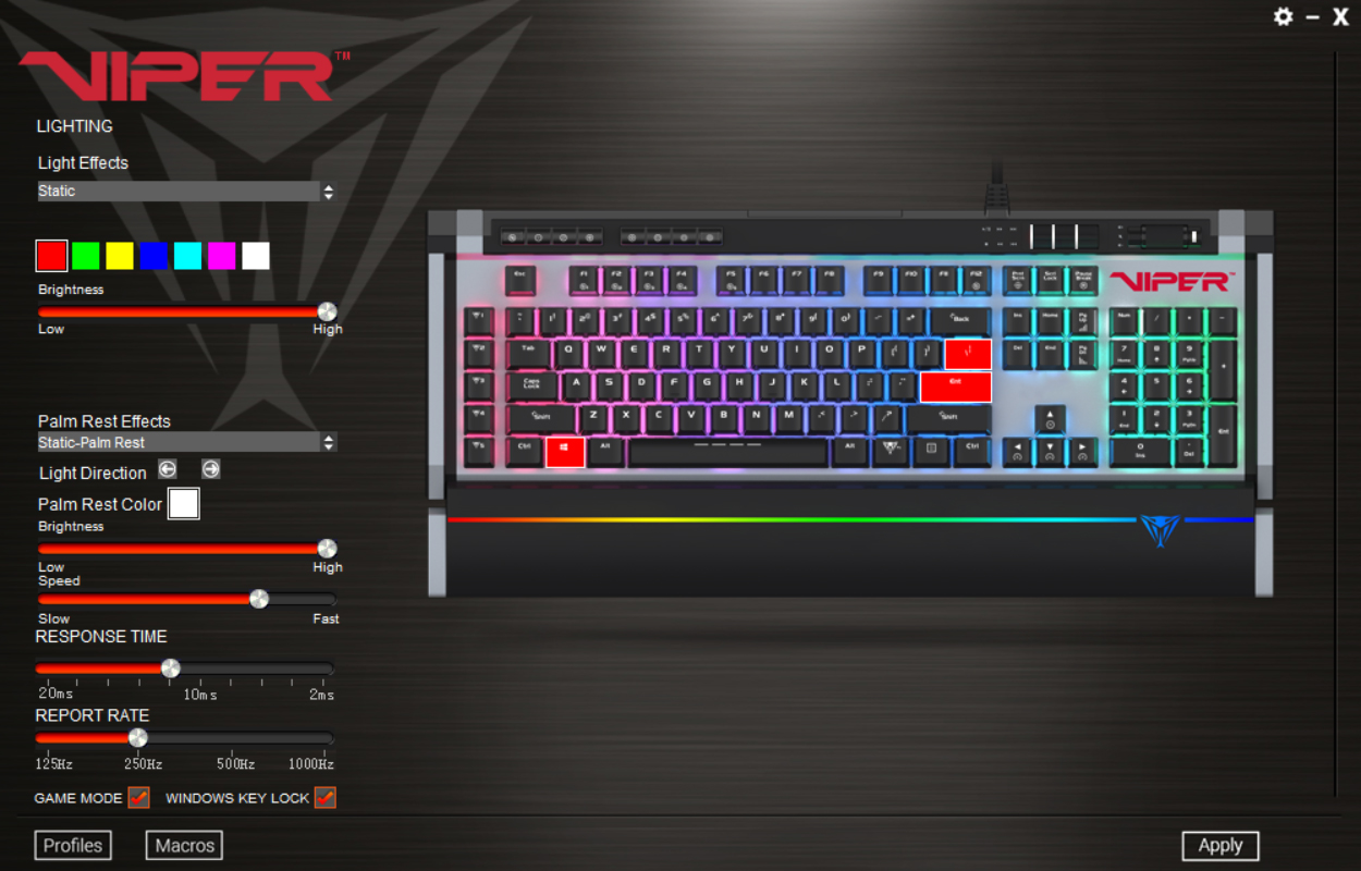 The keyboard software is nowhere near as compartmentalised as the Viper Mouse software, meaning it was easier to navigate and use specific functions that the V770 was designed for. It allows for simple adjustments to the response time and response rate, as well as easy access to macro recording located near the bottom of the application, or by clicking on individual keys.