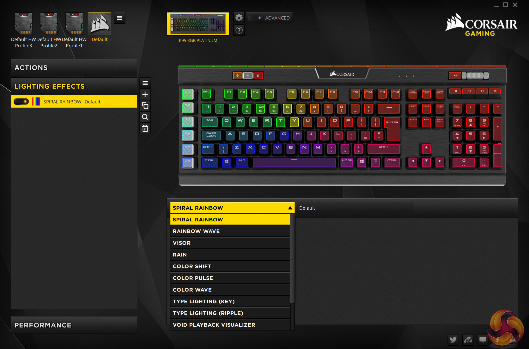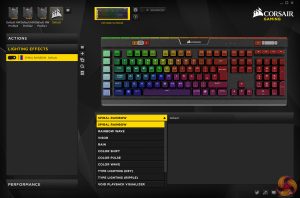 The next tab gives you control over the RGB lighting. The K95 RGB Platinum is very sophisticated in this regard, as there is simply so much control given to end-users. You can choose from one of several preset modes (including rainbow, wave, ripple, static etc) or even create your own effect.