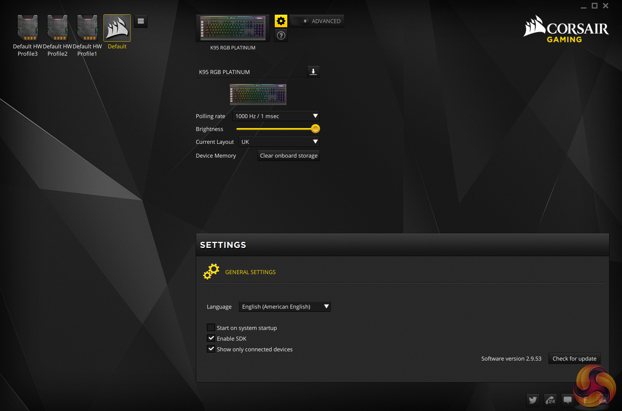 The first screen that greets you is a simple home page. The K95 RGB Platinum is detected by the software and a thumbnail of the keyboard appears at the top of the screen to let you know it has been registered.