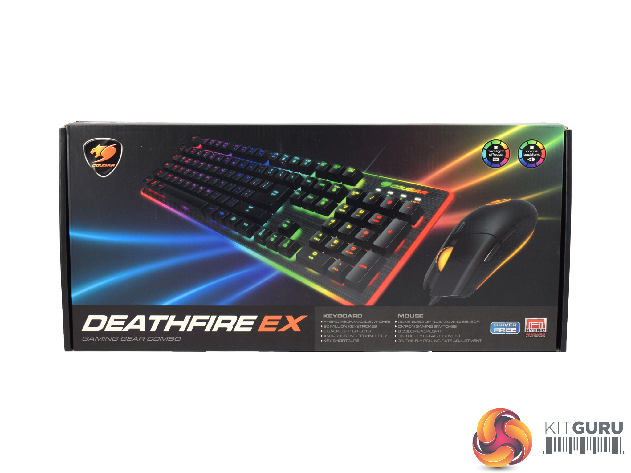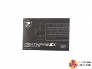 The Cougar Deathfire EX combo ships in a colourful box, with a photo of the keyboard and mouse taking up most of the front of the box.