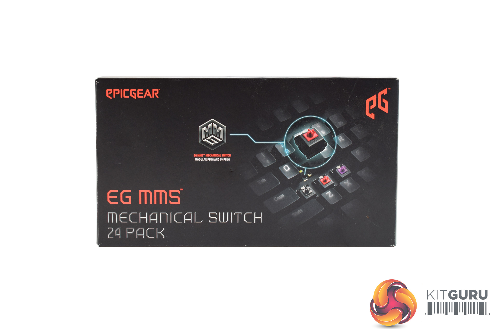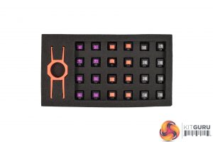If you do buy the extra switches, they arrive in a small box with 24 switches inside, comprising of 8 sets of 3 different switch types. These switches are actually EpicGear's own design, though they are essentially Cherry MX clones: the Purples are tactile and clicky, Oranges are tactile and non-clicky, while Greys are linear and non-clicky.