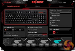 Above you can see the first two pages of the DeFiant software. Immediately, I think it looks very dated, while there is also a lot going on on the first page. This first page lets you re-map functions on a per-key basis, which is good to have, while you can also edit 1 of 4 different profiles.