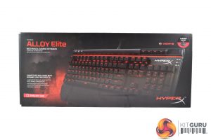 The HyperX Alloy Elite ships in a dark box with a large product photo visible on the front. There is also some red accenting which ties in with the red backlight of the keyboard.