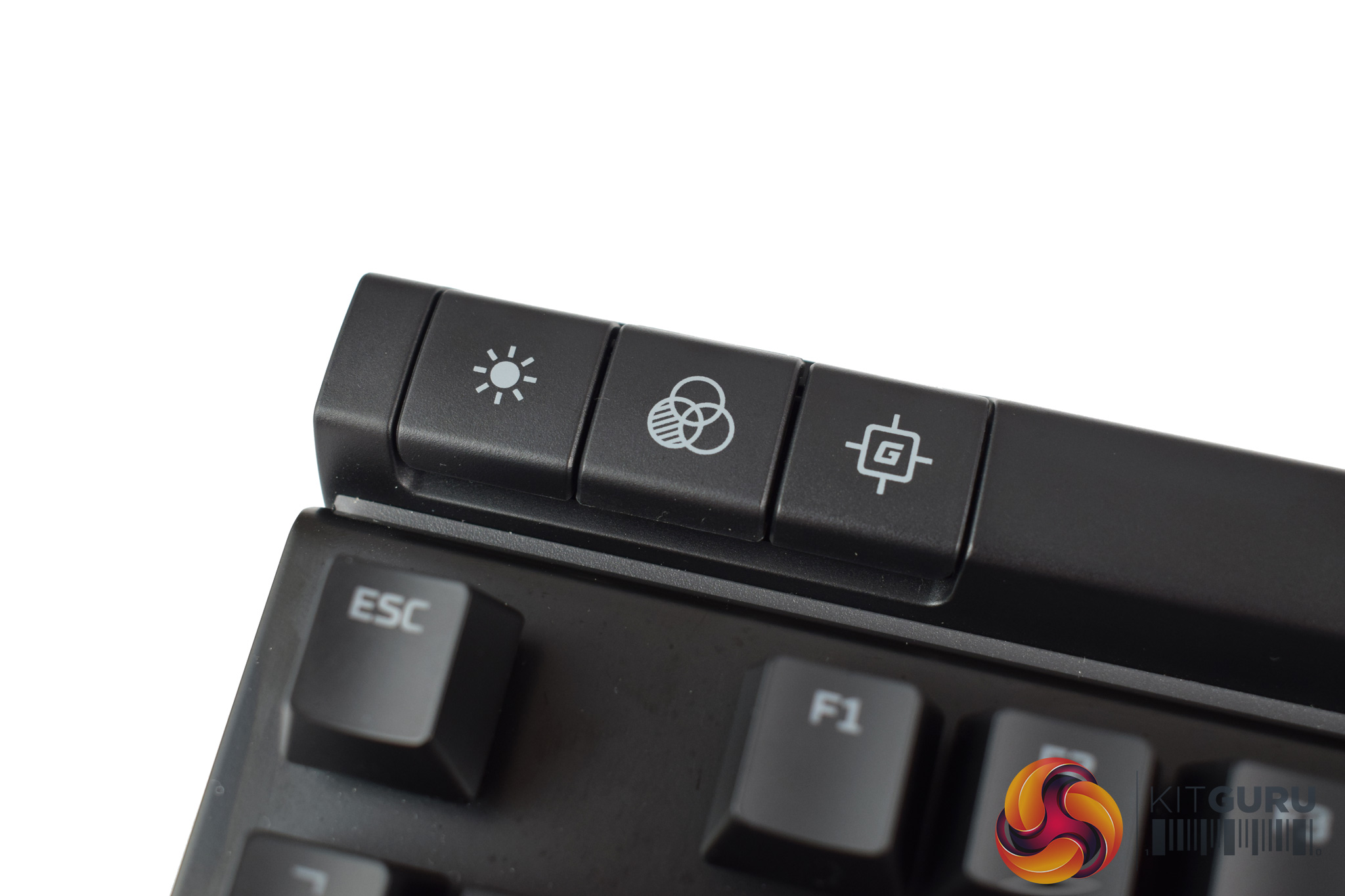Two of the more obvious differences between the Alloy FPS and the Elite are the dedicated LED and media controls. Above, left, you can see the LED controls that are on the left-hand side of the board. From left-to-right, these buttons are as follows: brightness, LED mode, and the game mode enabler.