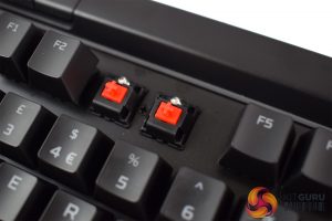 Prising off two keycaps reveals the Cherry MX Red switches used below. This is an interesting area of discussion as the Alloy FPS originally launched with only MX Blue switches available (though other variants popped up a bit later), and I am now told that the Elite will only be available in the UK with MX Red switches, though other regions will have the choice of Brown and Blue switches as well. We will discuss this more on the next page.