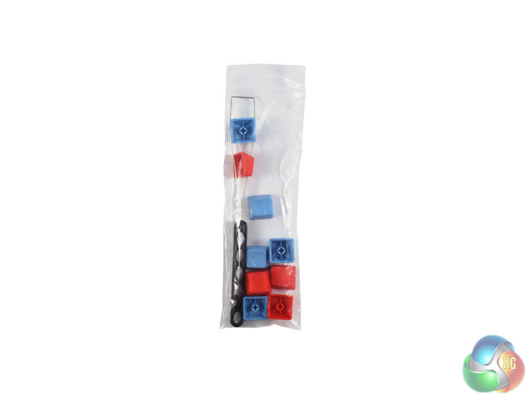 Inside, there is pretty detailed user manual, as well as 8 replacement keys – 4 blue, 4 red. A keycap-puller is also included.