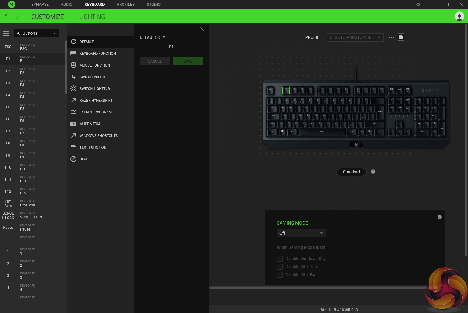 The first of these areas is the ‘Customize' tab. Here you can re-map pretty much all of the keys to pretty much any function you can think of – be it media controls, a mouse function, or to switch profiles on the keyboard. There's also support for Razer's Hypershift feature, where you can assign a secondary function to any of the keys – which is great to games where you want to use a lot of macros. The Customize page also lets you save up to four profiles directly to the BlackWidow's on-board memory, while you also have effectively unlimited profile storage that is linked to your Razer account in the cloud.