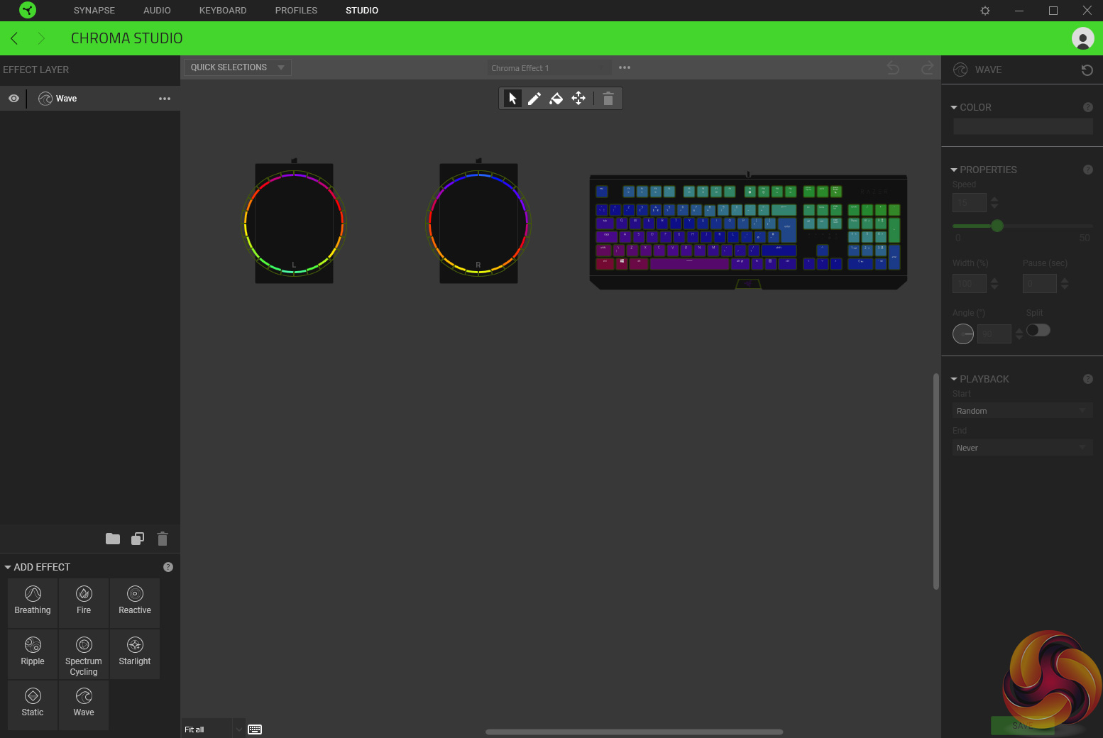 After that, there's the ‘Lighting' tab. At its most basic, you can adjust the LED brightness, configure when the LEDs turn off, and choose from a number of quick effects including ‘fire', ‘ripple' and ‘spectrum cycling'. Things get more interesting when you configure an advanced effect through Chroma Studio – this gives you control over the BlackWidow's LEDs on a per-key basis, and you can stack multiple effects, change the speed and direction of the effects, and decide when the effect starts and stops. It's very in-depth but also quite easy to get the look you are going for.