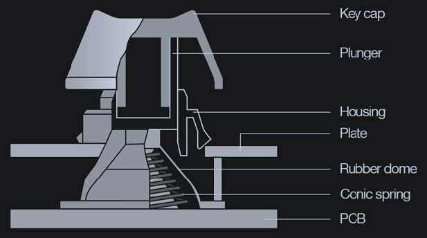 The switches are another area of interest, as they are Topre's own capacitive switch. Interestingly, they are not actually mechanical as they still use a rubber dome at the base of the switch (see above diagram, courtesy of Seasonic). However, the switches are compatible with most keycaps due to Topre's use of Cherry MX stems.