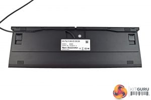 On the underside of the keyboard, we find four anti-slip rubber feet, as well as the usual height-adjustment stands. There are also two channels for cable-routing, so you can have the cable coming out from either the left or the right side of the board.