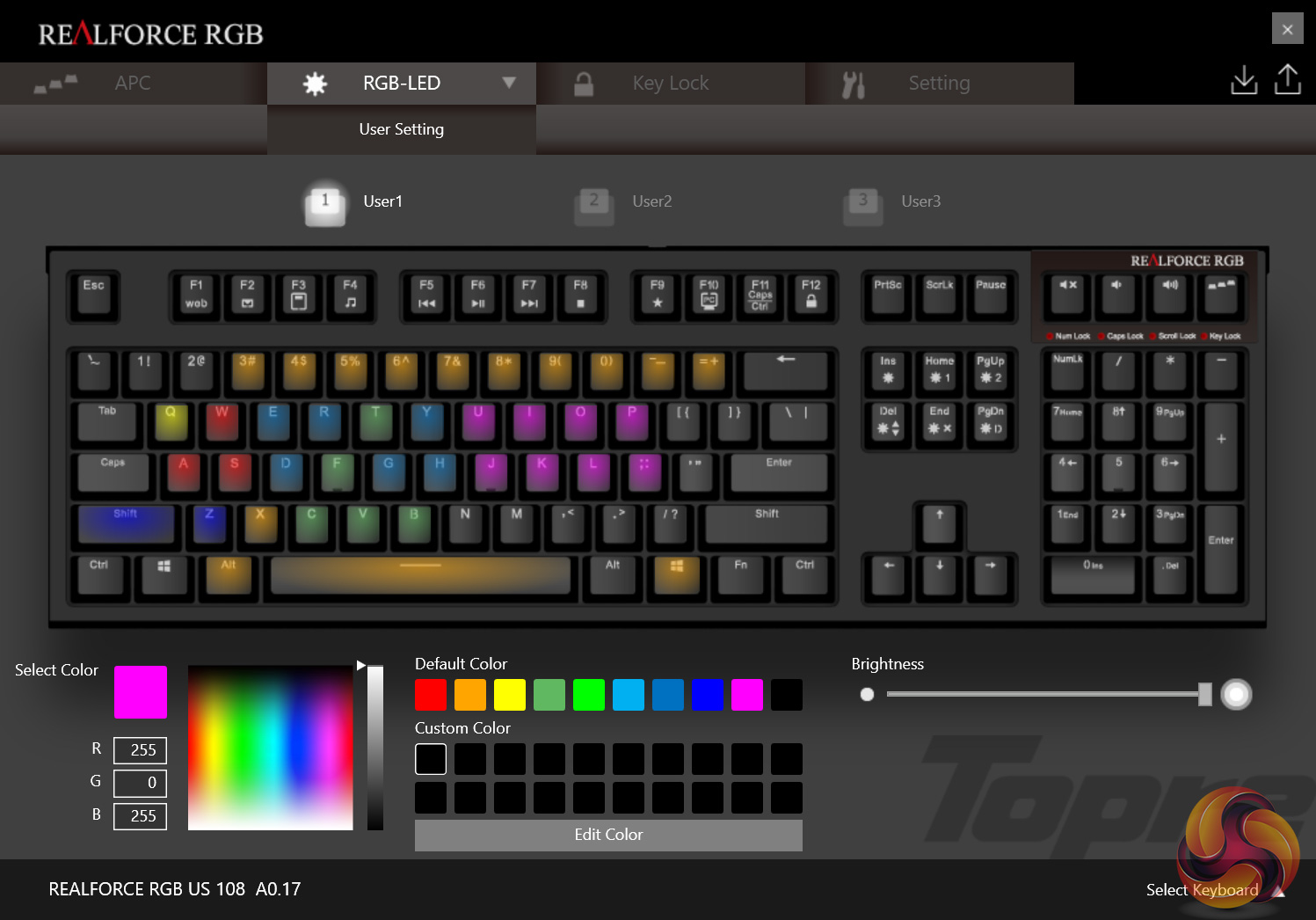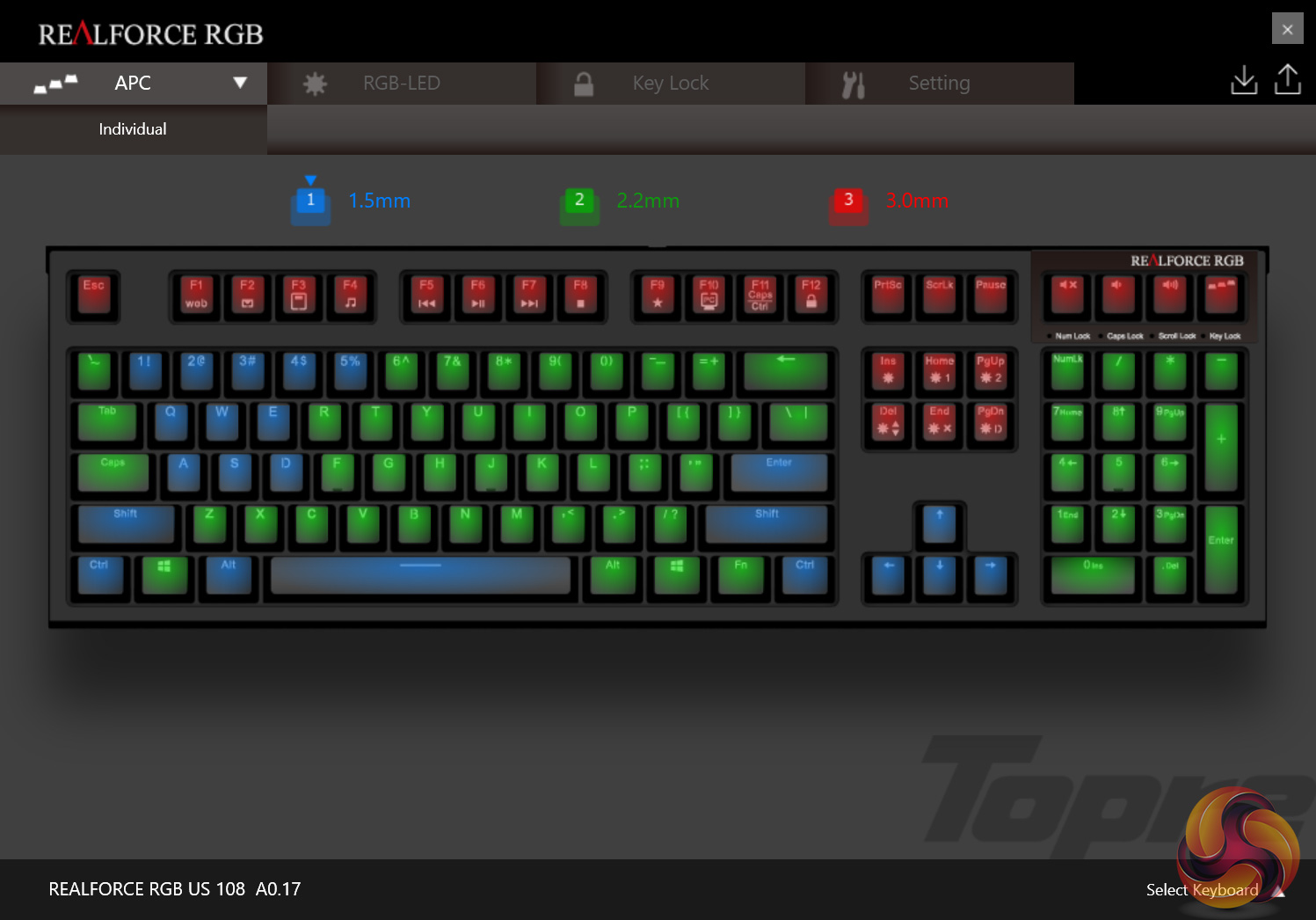As you can see in the second screenshot, I set the keyboard to use all three actuation distances in different areas of the keyboard. Maybe you want to have the QWEASD keys at the fastest, 1.5mm distance, but the lighting controls at the slowest, 3mm distance – no problem. Things are also helped by the simple colour-coding system Topre have used – blue keys means they are set to 1.5mm actuation distance, green is 2.2mm and red is 3mm.