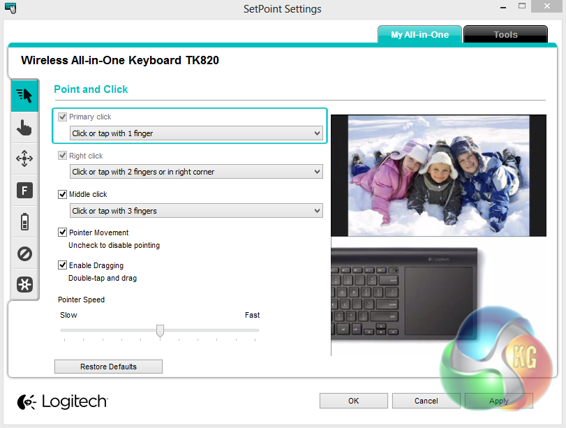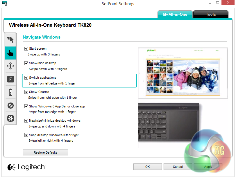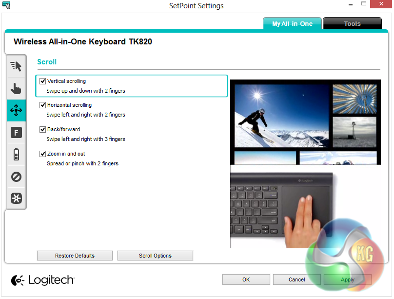 Logitech instruct us to download the software for the keyboard from their website, which lets us set up the multi-touch gestures for the touchpad.
