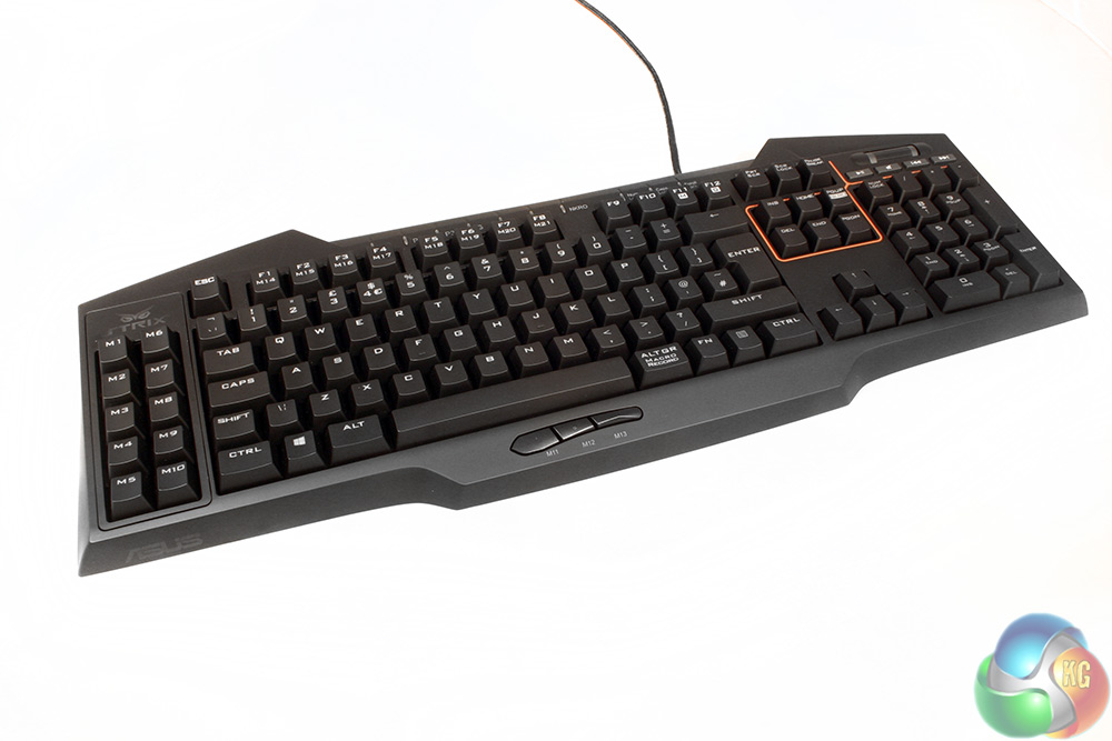 The Asus STRIX Tactic Pro is a quite a striking looking keyboard, thanks in part to the unique shape. It has rounded, but pointed corners to it, with an edge that falls off at an angle – less than 90 degrees.