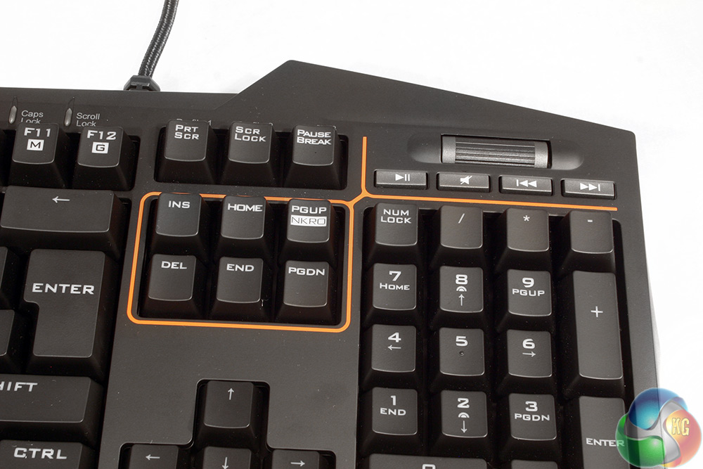 It is uniform matt black across both the keyboard base and the keys themselves, with a soft plastic feel across all surfaces. The only colouring (before lighting) is a thin orange line that separates off the media buttons and the control pad keys.