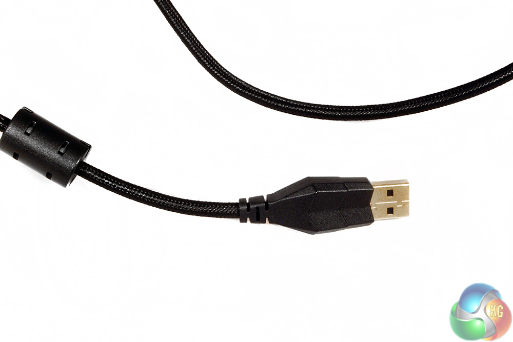 The cable for this keyboard is braided and features a gold plated connector with a unique looking header. This might make it a bit easier to identify with all the other mass of USB devices at the back of a PC.
