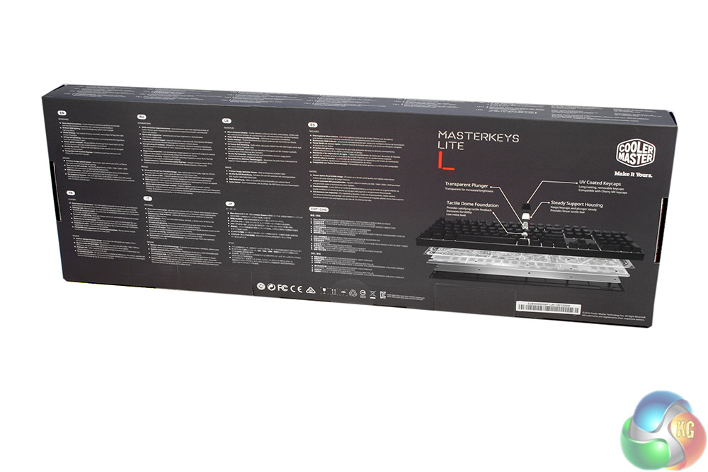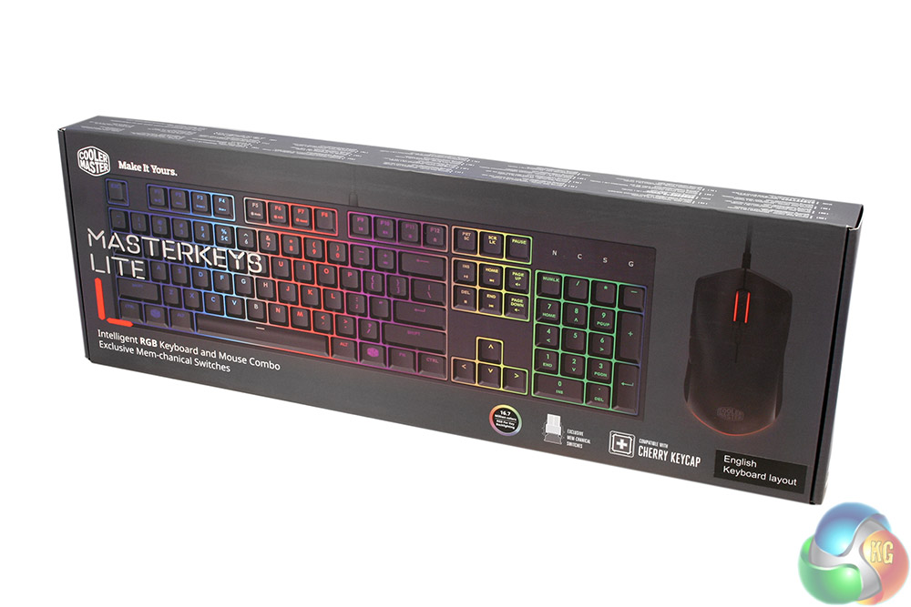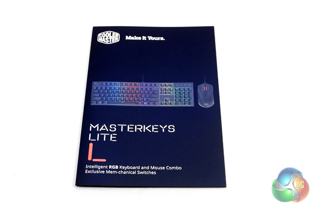 The packaging for the Cooler Master MasterKeys Lite is very conservative, essentially wrapping around the products with cardboard and a little padding – this is not a box that takes up a lot of room. However you will not be confused about what you are buying, as there is a big picture of the keyboard all lit up in a multitude of colours, with the mouse along side it.