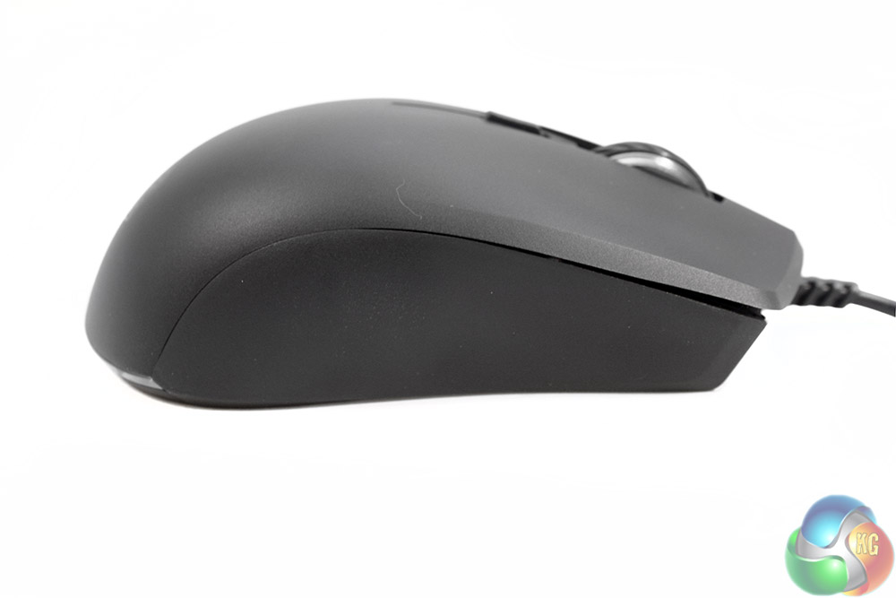The left and right sides of the mouse are near identical, with no thumb or finger grip material whatsoever on either. However the left does feature the classic two side-buttons, which provide forward and back functionality.