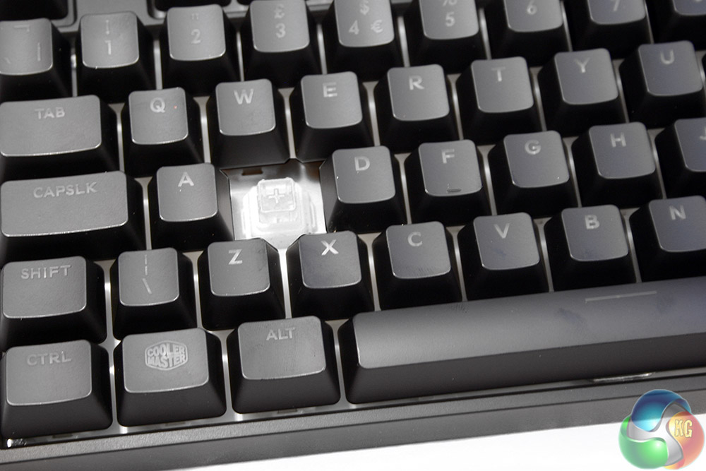The keycaps are hard to remove, but if you pop them off you can see the white base for all of the keys. You can also see that the switches are designed to look just like mechanical housings, but they are not. They are however made of clear plastic, so should not inhibit LED lighting like some mechanical switches do.