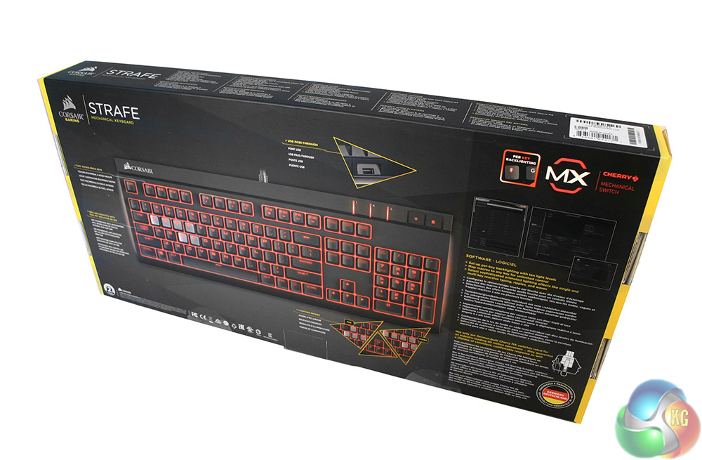 The packaging for the STRAFE is very typical of Corsair, with a high quality box, mostly in grey and black with a yellow panel at the end to break it up. The front and back have large pictures of the keyboard itself, along with some of the optional keys in place.