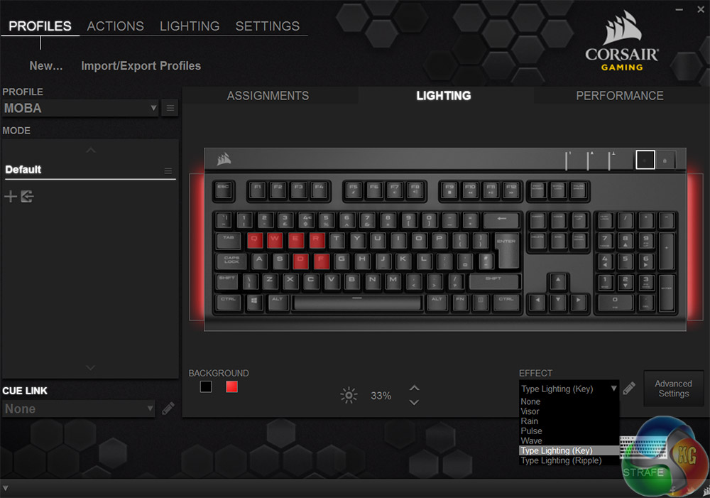 It's still not particularly easy to understand from the offset and can require some playing around with. Once you have gotten over the hump in the learning curve though, it is some of the best peripheral back-end software available. The only real difference between this version of it and what you have access to with some of Corsair's higher end gaming products is that it is monocolour. In this case, the only lighting options are red, so whether you have rain effects, reactive lighting, ripples, waves or all of them on at once, they are always red.