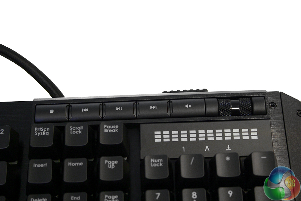 At the other end of the board we have the volume control and media keys – again, looking much like the set up on the K70 keyboard. These are the same button types as the profile switches and they occasionally get stuck when you press them down. Nothing a good wiggle cannot fix, but it is a mild annoyance.