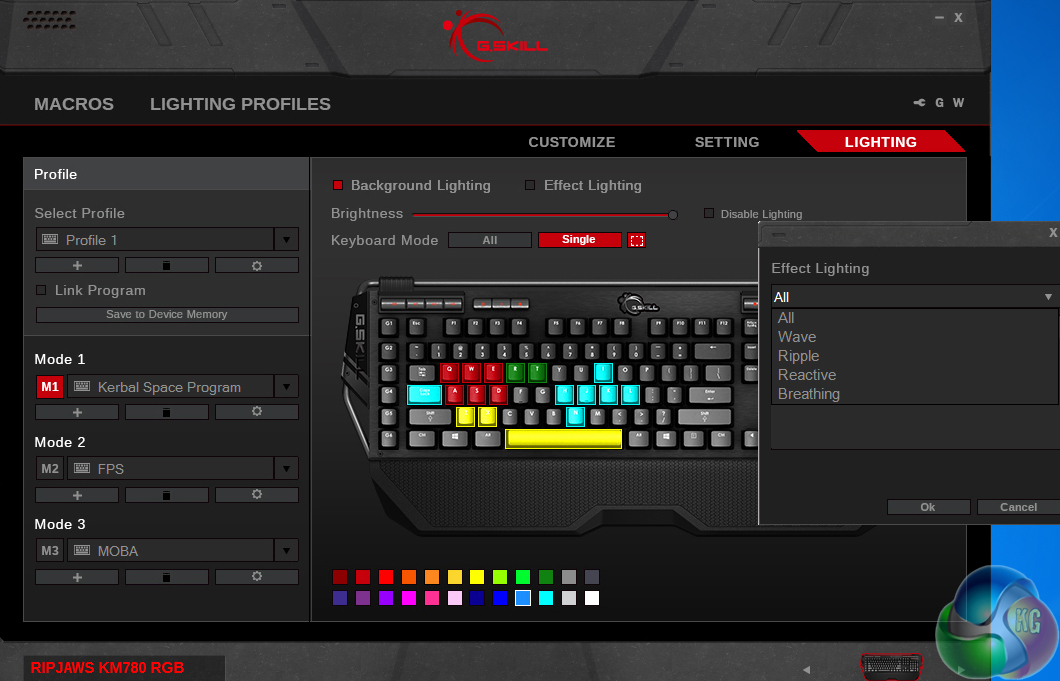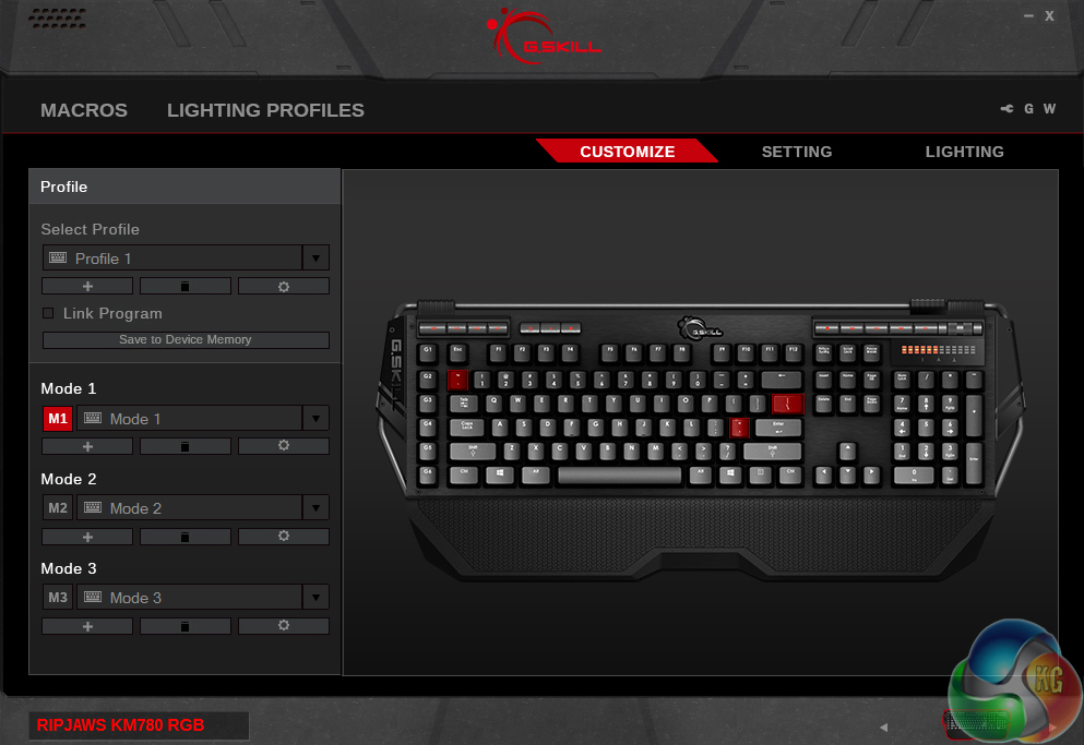 The software for the G.Skill KM780 is pretty fully featured. Keys can be easily remapped or given different functions and macros can be recorded and tweaked, with set delays between presses, or none at all. There are three modes that can be switched to on the fly and the profiles can even be stored locally on the keyboard itself, so if you switch systems on occasion you will still have all of your custom key presets.