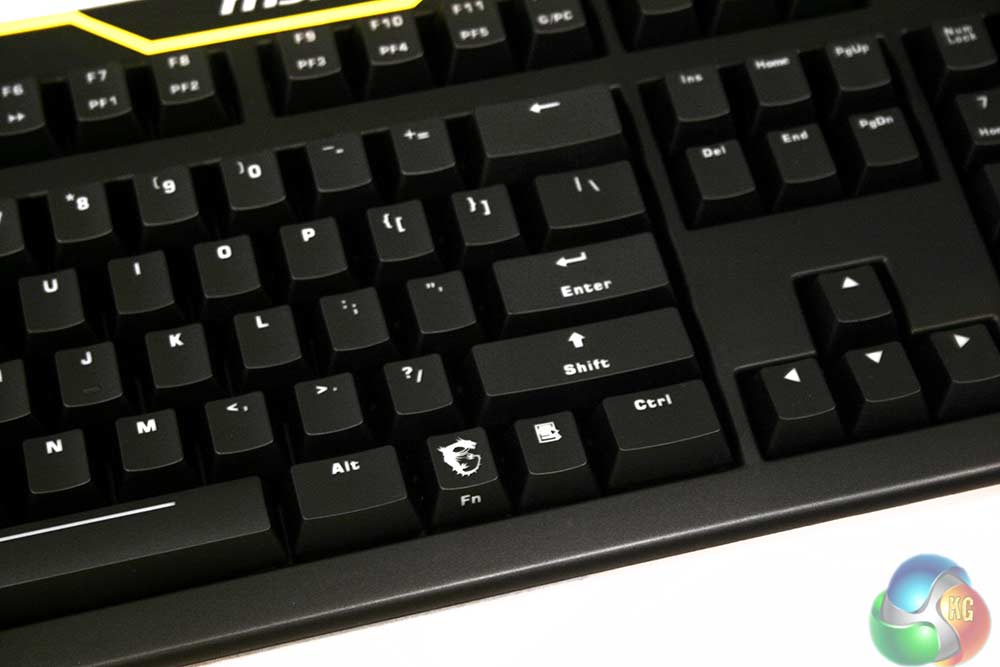 Notice the interesting choice MSI took of making the enter key a half size one, replacing the upper half with and therefore giving you quick and easy access to (regardless of its US labeling) the hash tag key. Presumably the MSI developers are big Twitter fans.