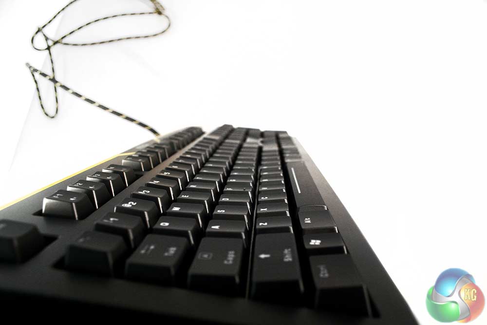 The keyboard itself is clearly styled with gamers in-mind, with its matt black finish and yellow go-faster-stripes across the top. The keys aren't laser etched on or anything that will rub off, instead they have clear plastic indicators, which light up when you have the illumination turned on. As you might expect, the LED backlighting is yellow.
