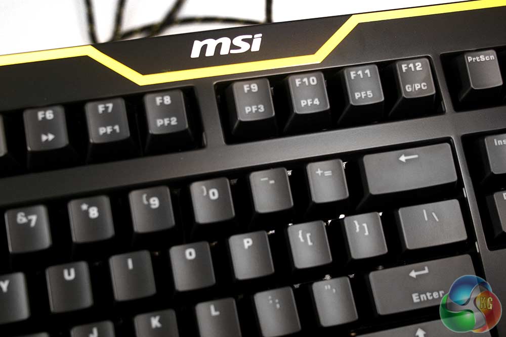 The MSI logo features prominently across the top, sitting just above the F keys, each of which has some sort of secondary function. The former six handle media applications, giving you the ability to raise and lower the volume, as well as skip tracks, mute, play and pause. Beyond that are the six profile options, though under F12, you'll also find the switch for gamer and PC mode. The former stops the Windows key from working, making it that bit harder to accidentally minimise your game during the height of the action.