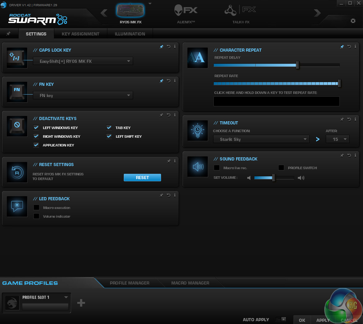 The back-end software on the other hand, Roccat's Swarm system, is very versatile. It features all of the major adjustable features you would expect from such a board: key remapping, repeat rate adjustments and backlighting tweaks, all in a very easy to understand manner. The interface is attractive and intuitive and you can even connect it up to your smartphone for added functionality and information on the go.