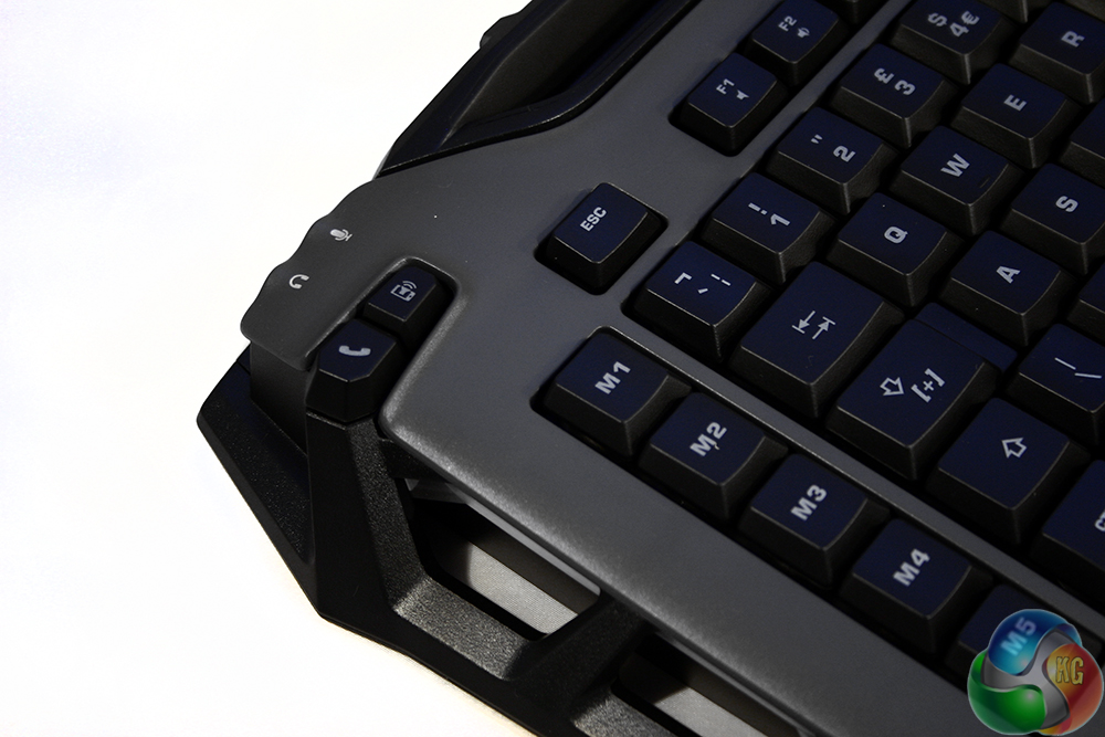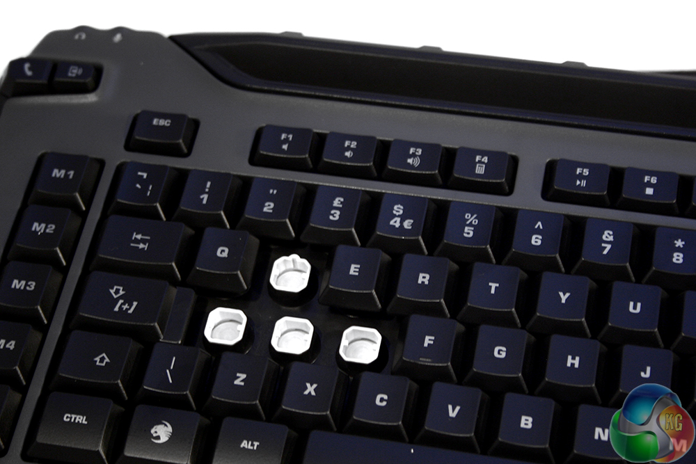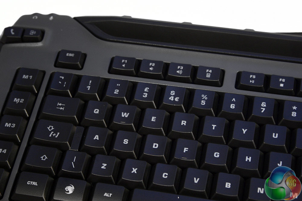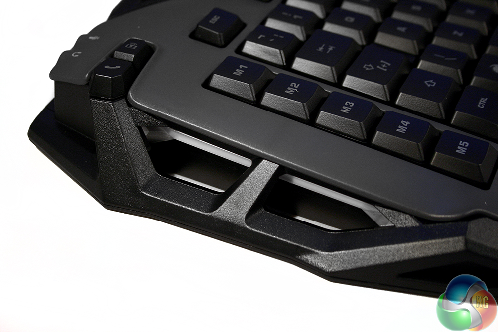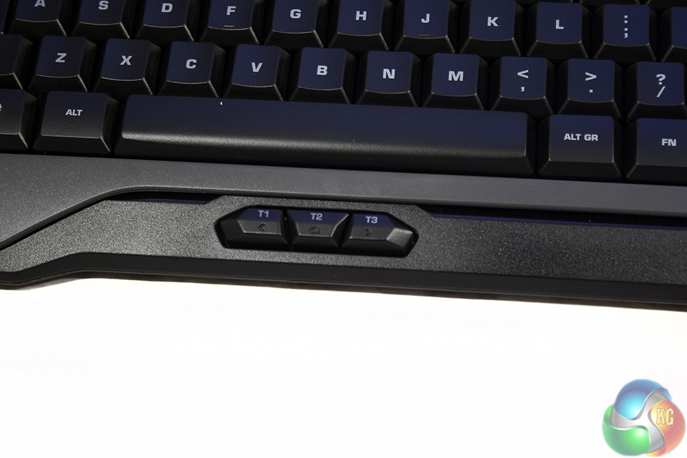 Although every key on the Skeltr is re-mappable and has dual functions thanks to the EasyShift capabilities, there are some dedicated macro switches too. Just beyond the left hand border of the keyboard are the M1-5 macro switches. Using a very different, super-short-travel switch system, are a trio of T1-3 macro switches just south of the space bar too.