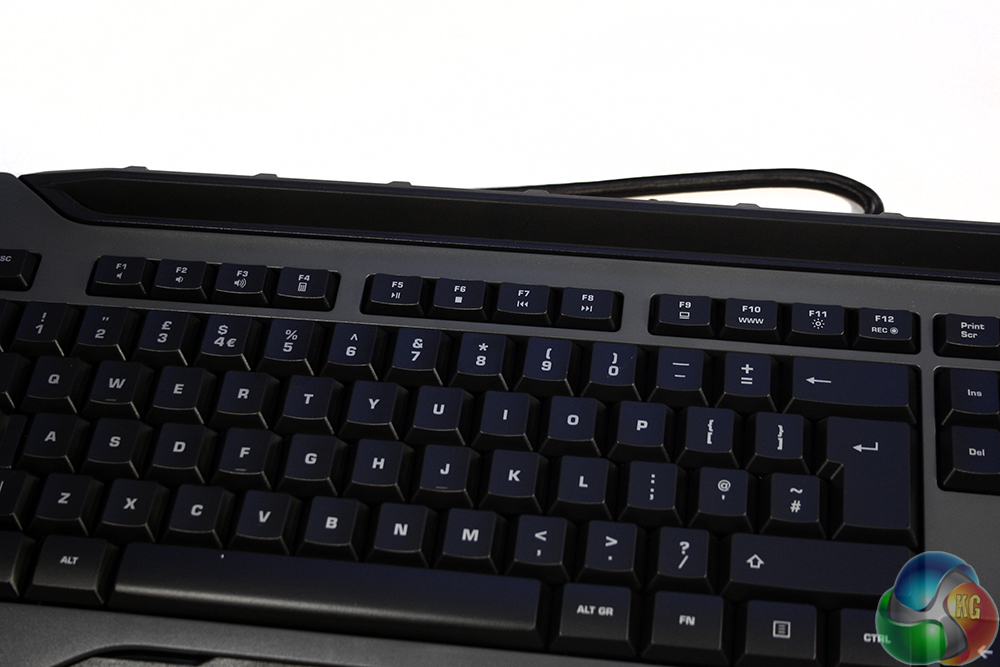 Media keys on this board are secondary functions of the F keys, with volume, play/pause, skip tracks and stop commands all available. These are alongside quick shortcuts for the calculator, browser and controls for the brightness. The F12 key also has a quick function for recording macros on the fly.