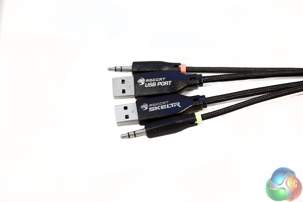 The cable for this board is dual USB due to the pass-through port, but also splits off into 3.5mm microphone and headphone connectors. They are nickel plated and the cable is braided to a high quality.
