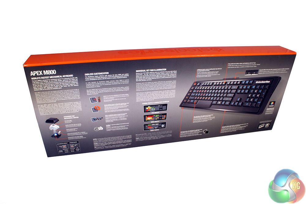 The back of the box details some of the board's more impressive features. Steelseries highlight the ability to remap any key to whatever you want, create timers that affect lighting (to remind you when certain items are ready for usage), cloud synchronised profile switching and endless lighting options. They obviously also place focus on the key technology incorporated into the Apex M800.