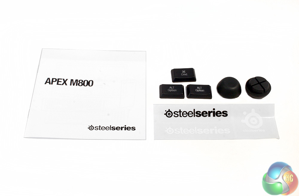 Along with the Apex M800 board itself, you also receive a quick-set up guide, a few Steelseries stickers, some alternate key-caps for the Alt keys and a pair of higher profile rubber feet.