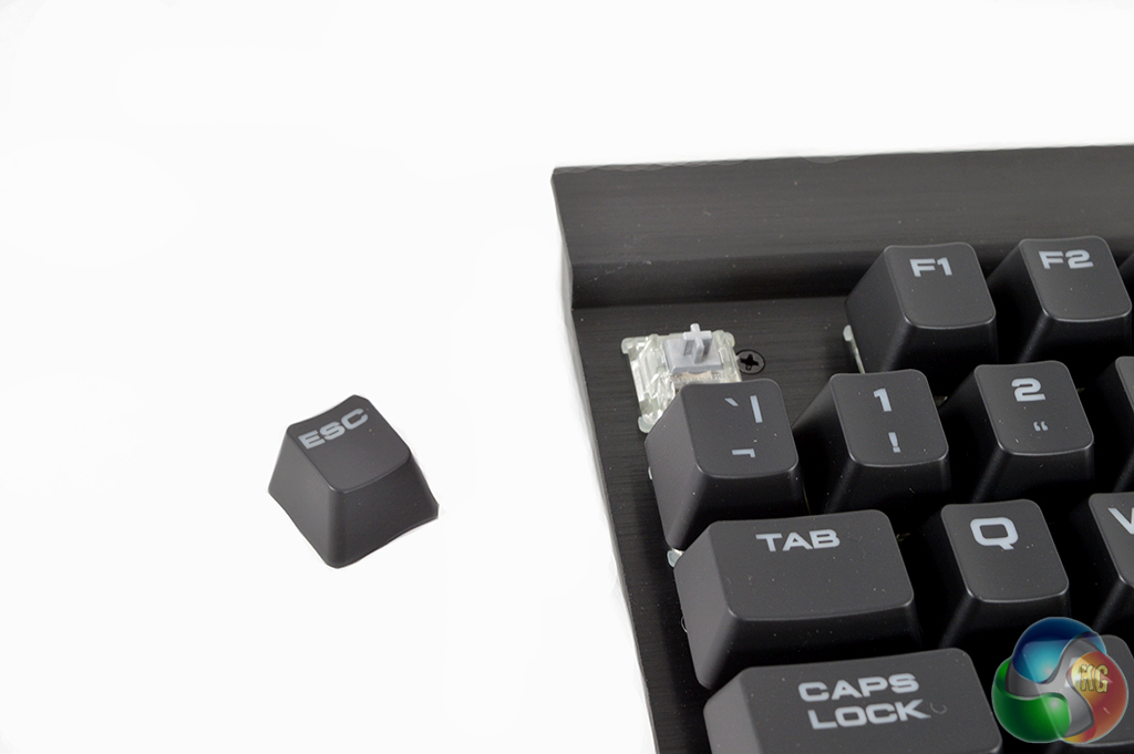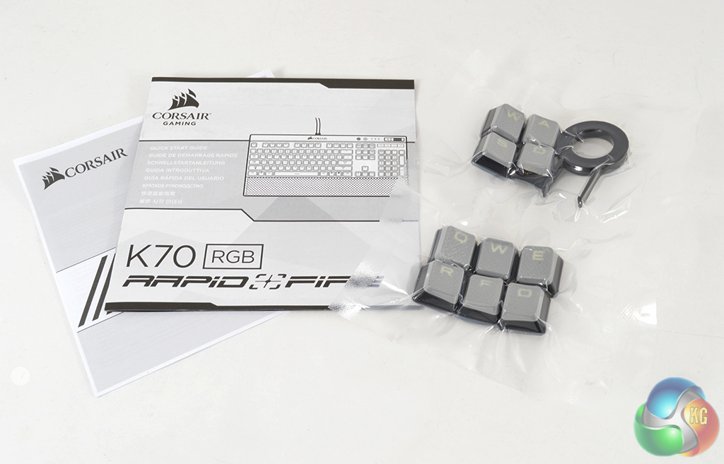 Aside from the keyboard itself, buyers will also find a few accessories in the box, including some textured, grey replacement key caps for WASD as well as some other keys traditionally used in PC games. There is also a key cap removal tool, so you don't have to worry about damaging your switches by prying the caps off.