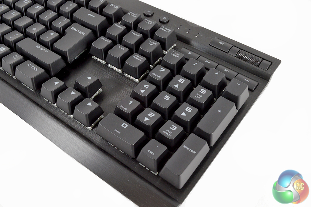 Corsair has a simple media key layout for the K70, with a wheel for volume control, which I personally like quite a bit. You will also find some play/pause and skip forward and back buttons.